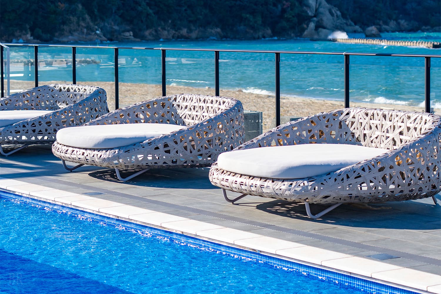 目の前に広がる広大な海と、南国の楽園をイメージした海外仕様のプールが主役。